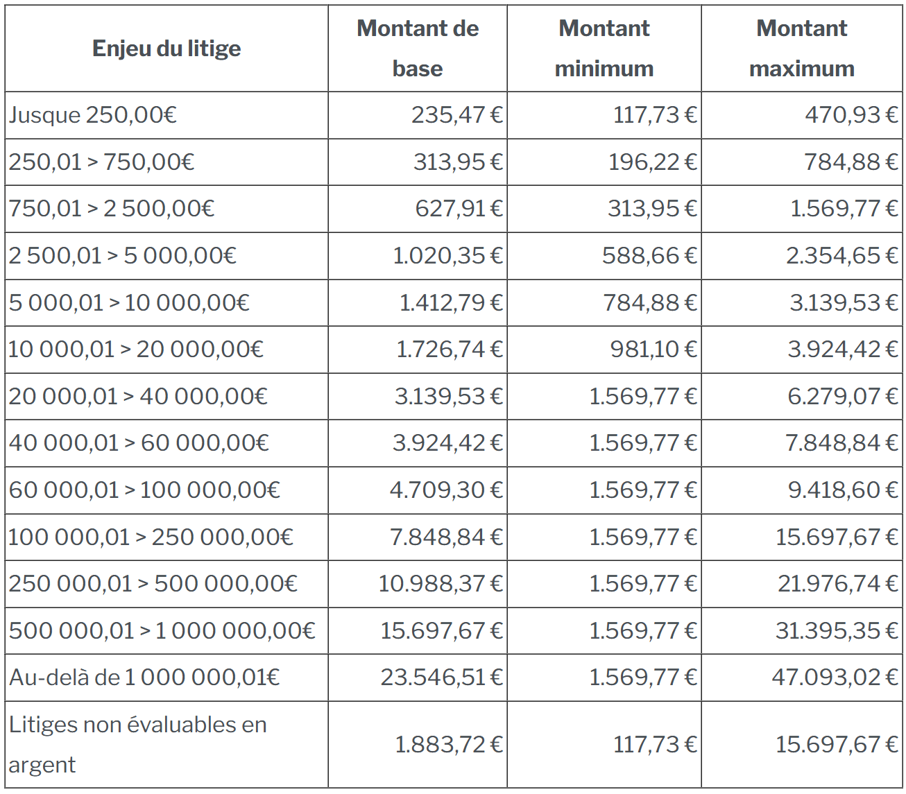 (*) l’enjeu du litige correspond à la somme des montants cumulés qui peuvent être raisonnablement réclamés par les deux parties en justice.